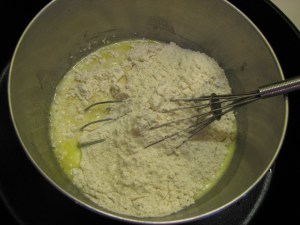 In a separate bowl, whisk the eggs, sugar, olive oil and lemon juice together until blended. Add the flour mixture, pour in the milk, and stir well to combine. Place the batter in the prepared pan. Bake for 30 minutes, or until the edges are golden and a knife inserted in the center comes out clean.