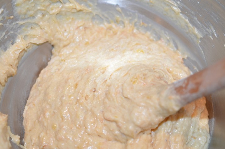 To make the batter, in a large mixing bowl, cream the sugar and butter. Stir in the eggs, bananas, milk or yogurt, and key-lime juice. Add the salt, ginger, and grated toasted coconut and mix well.